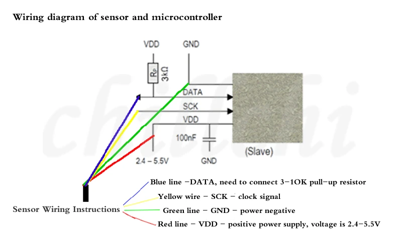 Проводка: Красный провод VCC-источник питания положительный зеленый провод GND-отрицательный источник питания синий провод данных-DataYellow линия SCK-время