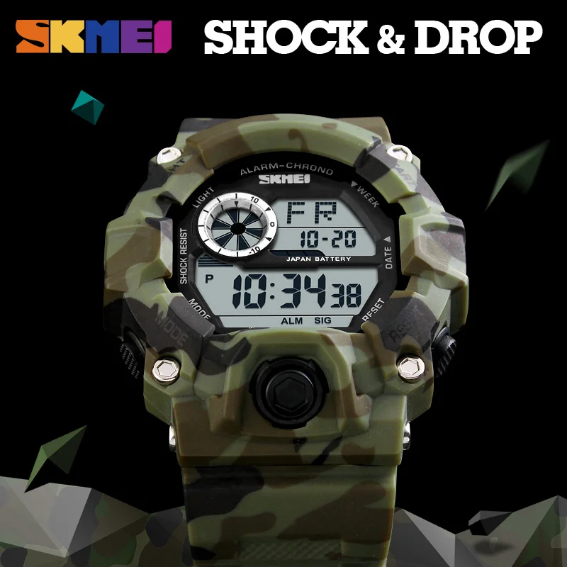 SKMEI Военные цифровые часы мужские водонепроницаемые часы с будильником светодиодный задний свет ударные спортивные наручные часы мужские камуфляжные армейские часы 2017