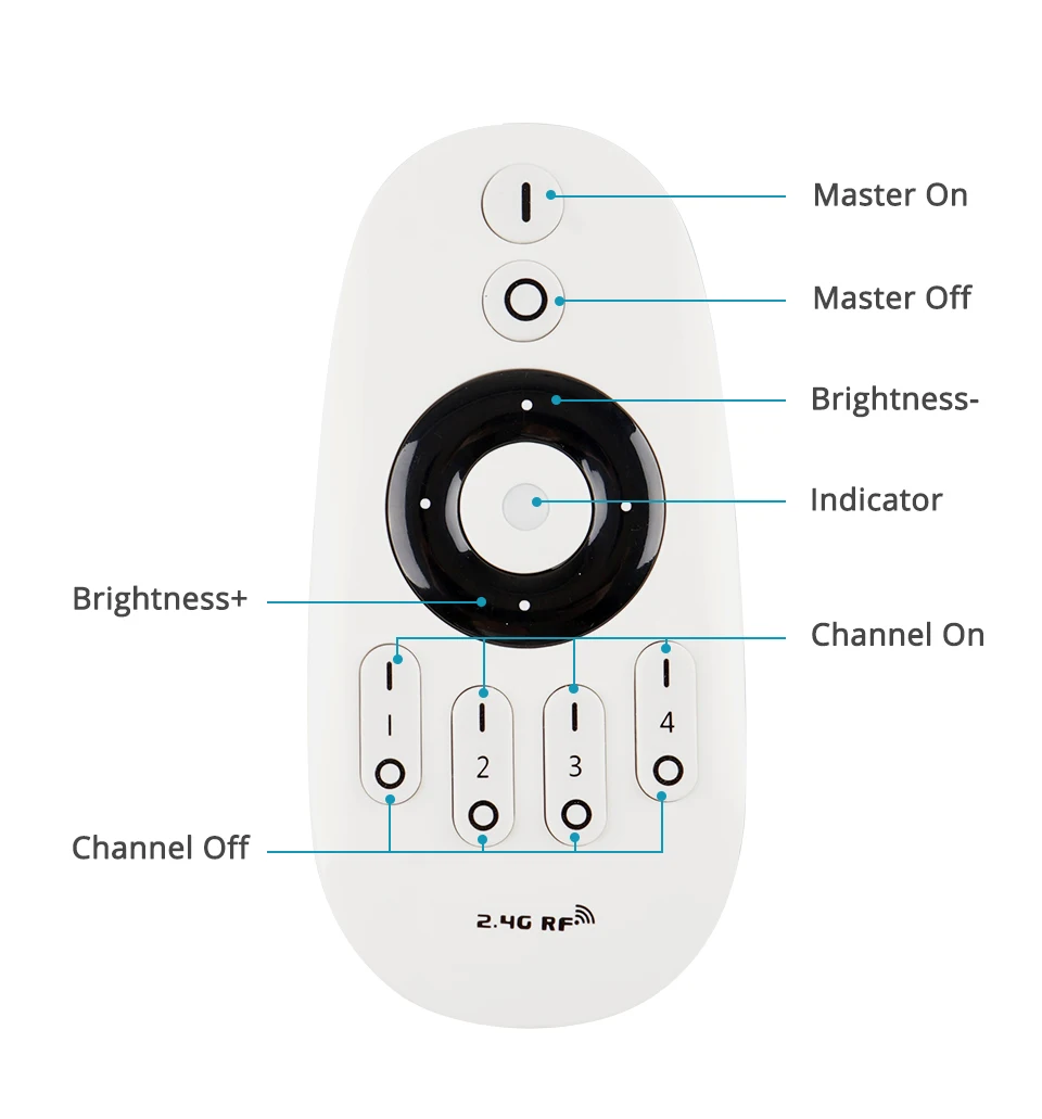 2,4G беспроводной пульт дистанционного управления, вы можете легко регулировать яркость с расстояния, может управлять многочисленными FL-3060A огнями в 4 группах.