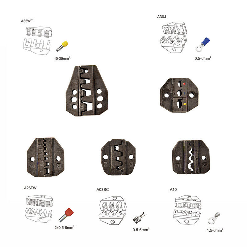 Область применения набора электрических соединителей: 03BC обжимные плашки (ОБЖИМНАЯ челюсть): применяется to0.5-6mm2 (16-10AWG), используется для неизолированных вкладки и сосудов 26TW Плашки для обжима (опрессовочная челюсть): нанесите to2 * 0,5-6mm2 (2 * 20-10AWG), для изолированного неизолированного кабеля и торцевых втулок Опрессовочные плашки A10 (опрессовочная челюсть): применяется to1.5-6.0mm2 (16-10AWG), используется для неизолированных клемм 30J Плашки для обжима (ОБЖИМНАЯ челюсть): применяется to0.5-6.0mm2 (22-10AWG), используется для изолированных клемм 35WF Плашки для обжима (ОБЖИМНАЯ челюсть): нанесите to10-35mm2 (8-2AWG), используется для кабеля неизолированных торцевых втулок Набор инструментов для обжима включает в себя: Hs30jобжимные плоскогубцы5 Сжатие литья челюстиЧерная парусиновая сумка из ткани ОксфордCrossS2Steel материал высокопрочная супер износостойкая отвертка* Примечание: посылка может иметь различные спецификации для выбора прессформы для обжима, в I дивизионе также есть набор пластиковых коробок с поставками, если вам нужна Посылка на заказ, пожалуйста, свяжитесь с Wangwang или по телефону!