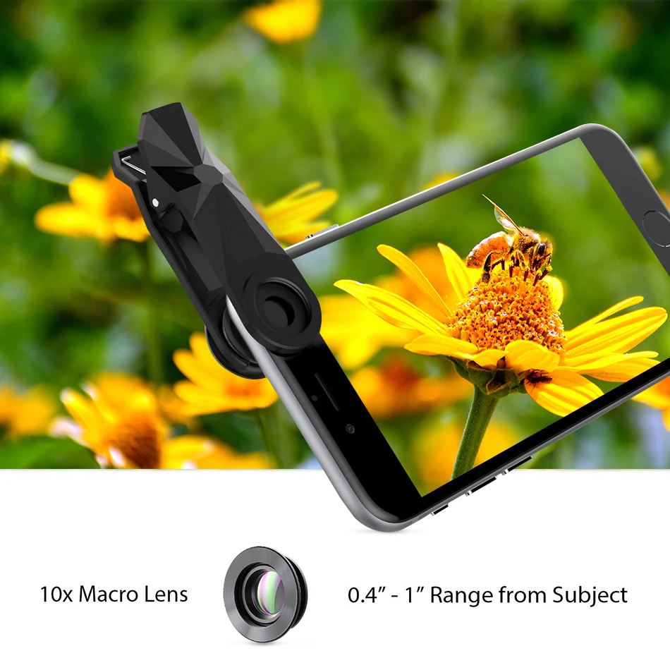 Легко крепится к любому мобильному устройству с помощью прилагаемого зажима. Подходит для передней и задней камер большинства смартфонов и планшетов и даже работает с веб-камерами для ноутбуков. Просто закрепите, сфокусируйте и нажмите для высокого угла удара, макро или рыбий глаз изображения и видео.