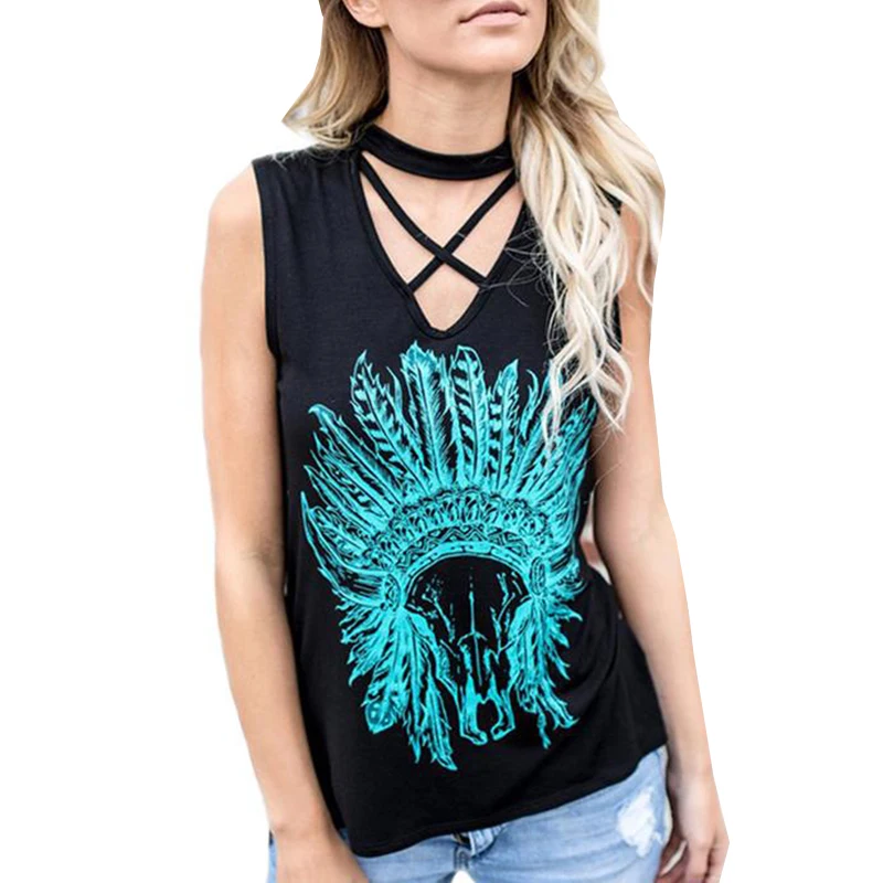 New Summer Tank Top Women Sexy Split Print Vest Casual Loose Cross Halter Sleeveless T Shirts Ladies Vintage Tops Tees SF317 Женская - купить