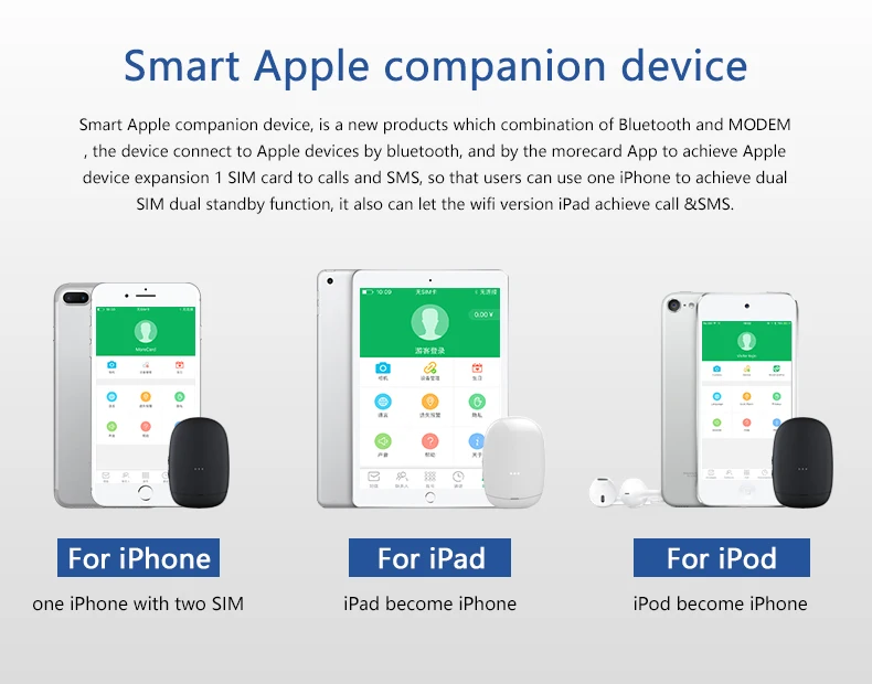 Это маленький смарт-гаджет Bluetooth, подключающийся к вашему мобильный телефон с помощью специального приложения, он позволяет Мобильный телефон с одной sim-картой для двух sim-карт, для телефонных звонков и SMS-операций. Он заменяет телефонные звонки и SMS-операции. Поддерживает сеть GSM. Служба сетевых данных не поддерживает. Технические характеристики: Тип sim-карты: Micro SIM Сеть: GSM Сетевой диапазон: GSM850MHz / EGSM900MHz / DCS1800MHz / PCS1900MHz Поддержка iOS:iOS7.1-12 Джейлбрейк: не нужен джейлбрейк Посылка: 1 x Bluetooth SIM адаптер Руководство по эксплуатации на английском языке-1 шт. 1 x кабель для зарядки 1 х хороший подарок