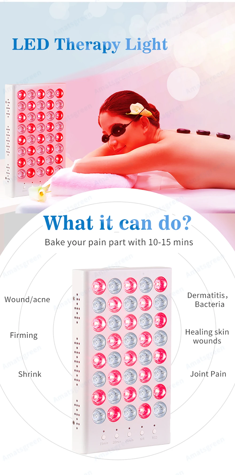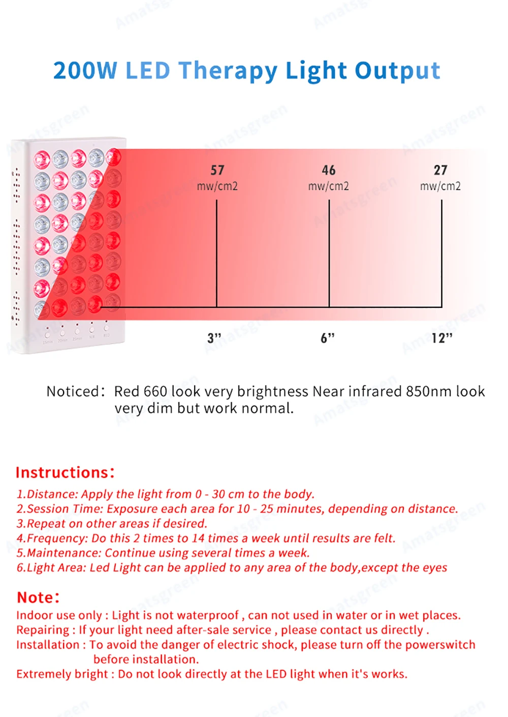 Как использовать? * Расстояние --- применимо от 0 - 2 метров. * Время сеанса --- длится 2 -15 минут в зависимости от расстояния. * Обслуживание-Продолжайте использовать несколько раз в неделю. Может ли это повредить мои глаза? Типичный человеческий глаз реагирует на длины волны от 400 нм до 700 нм; Светильник от этого устройства почти полностью невидимый Инфракрасный. Все, что вы можете видеть, это слабый красный свет. Красный и инфракрасный светильник полезен для глаз. Какая разница красный и N.IR? Красный светильник с длиной волны 630-660 идеально подходит для проникновения в клетки кожи и сальных желез, обеспечивает текстуру и тонус кожи, разглаживает мелкие морщинки, стимулирует выработку коллагена и в целом омолаживает внешний вид кожи. Ближний инфракрасный светильник с длиной волны 730nm-850nm проникает глубже в ткань, чтобы доставить энергию клеткам тела и через кость, чтобы помочь с заживлением глубоких ран, Мышечных болей, боли в суставах или травм нерва. Сочетание с преимуществами обоих, поэтому это популярный вариант. Ваши терапевтические огни отправляются в мою страну? Работает на местном уровне? Да, конечно. Мы отправляем во все страны по DHL / UPS / FEDEX... и т. Д. Терапевтические огни с широким напряжением (AC85-265V), которые работают в большинстве стран; И мы предлагаем вилки США/ЕС/Австралии/Великобритании на основе клиентов, где они приходят. Что насчет EMF на ваш светильник? Как опыт, все электрические продукты, которые мы используем, будут генерировать некоторые EMF, но наши терапевтические огни с нулем, когда расстояние использования около 5», у нас есть инструмент для тестирования и проверки.