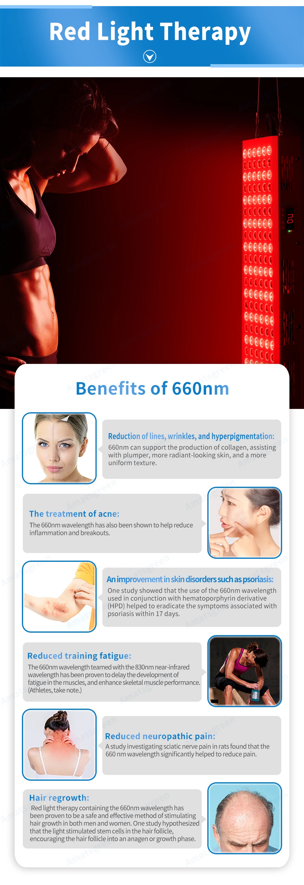 Преимущества различной длины волны: Выберите наиболее биологически длину волны является ключом к оптимизации преимуществ красный светильник и терапия около-Инфракрасный светильник. Красный светильник и длина волны около инфракрасного диапазона признаны за специальные регенеративные и терапевтические результаты, которые дают организму. Красный светильник длиной волны простирается от приблизительно 630нм до 810нм, а наиболее Научно доказанные преимущества-красный 630нм и темно-красный 660нм. Ближний инфракрасный свет начинается с 730 нм и продлевается до 1000нм. Около инфракрасного 810 нм, 830 нм и 850 нм длины волн, которые были научно доказаны, чтобы дать пользу. Как вы можете знать, 660nm mix 850nm (половина на половину) Длина волны была доказана, чтобы обеспечить терапию кожи и ткани. Длина волны 630нм (красный светильник) Длина волны 630нм идеально подходит для проблем с кожей, которые проникают в клетки кожи и сальные желёвки для омоложения тона и текстуры кожи путем разглаживания и вечернего удаления неровной пигментации. Преимущества уменьшения тонких линий и морщин; Улучшение состояния кожи в качестве псориаза; Восстановление роста волос; Лечение поверхностных Раков кожи; Лечение акне. Длина волны 660нм (красный светильник) Длина волны 660нм проникает глубже, чем длина волны 630нм, длина волны 660нм достигает всего диапазона тканей кожи, что способствует заживлению и регенерации. Преимущества снижения усталости при тренировках, воспаления, отечности следуют за травмами и невропатными болями; Улучшенное заживление костей и ускоренное заживление ран. Длина волны 810 нм (ближний инфракрасный светильник) 810нм с возможностью расширения черепа в головной убор, преимущества улучшения исцеления и восстановления, восстановление инсульта у некоторых пациентов, восстановление от травматических травм головного мозга; Ускоренное Исцеление и рост волос. Длина волны 830 нм (ближний инфракрасный светильник) Эта длина волны не поглощается организмом, он способен проникать глубже через кожу и ткань. Преимущества ускоренного заживления и уменьшения инфекции, улучшения восстановления и роста костей. Длина волны 850 нм (ближний инфракрасный светильник) Ближний инфракрасный светильник длиной волны больше, чем красный светильник длиной волны, от 700нм до 1000нм, который проникает глубже в ткани в клетки тела и может пройти через кость, чтобы помочь с заживлением глубоких ран, мышечные боли, травмы нерва или боли в суставах; Большинство людей выбирают ближний инфракрасный свет для лечения.