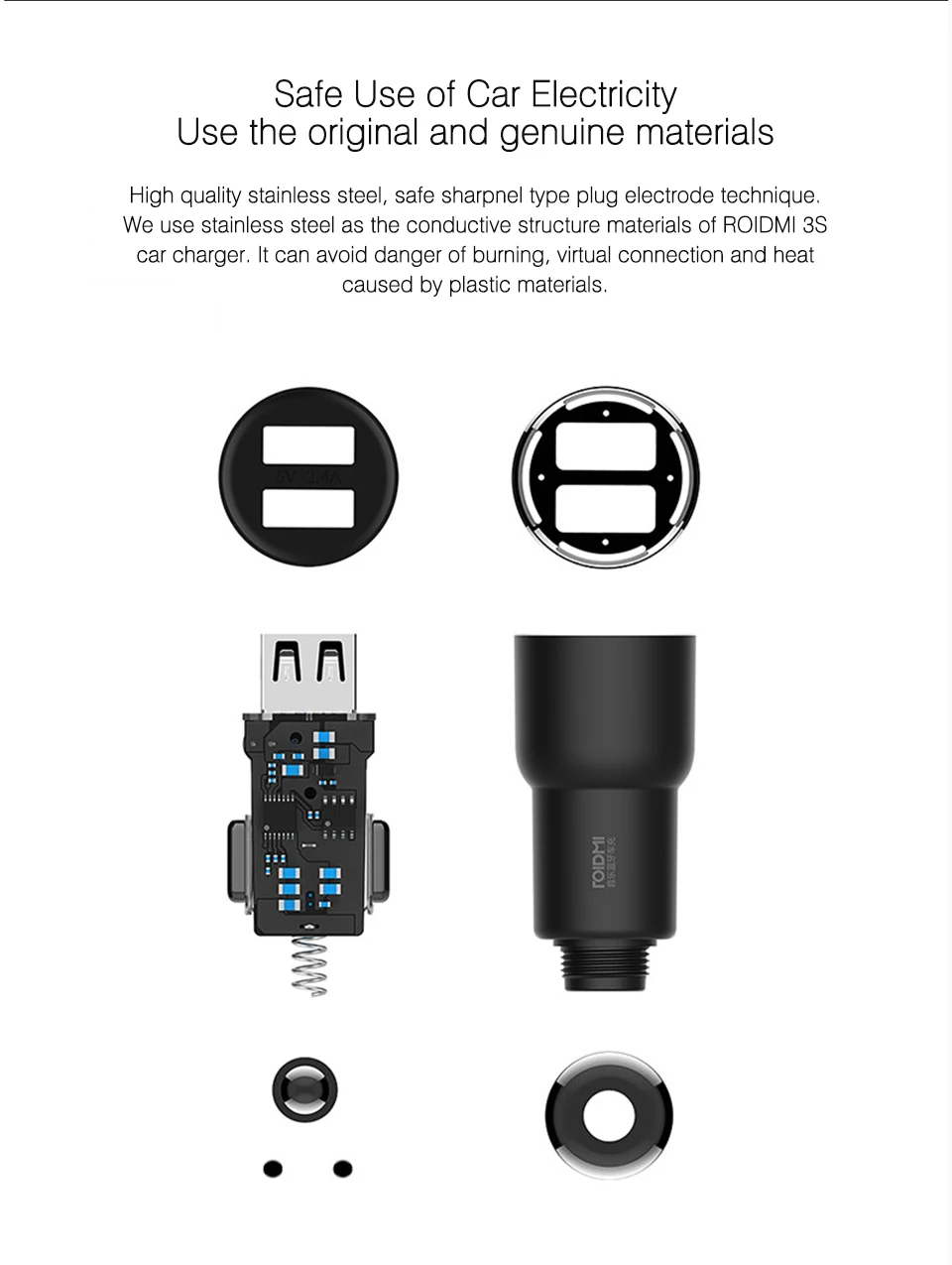 Основной Особенности: Оригинальный Xiaomi ROIDMI 3 S 5 В/3.4A автомобильное зарядное устройство адаптер Полностью совместим со всеми брендами автомобиля Реальное наблюдение за напряжением автомобиля 2.4A макс для одного выхода, 3.4A макс для двух портов быстрой зарядки Защита от множественных замыканий для обеспечения безопасности Bluetooth V4.2 BR/EDR Совместимость: Bluetooth 4,0 смартфон с Android 4,0 или выше системы и iOS Подключитесь к смартфону через Xiaomi Smart Home APP