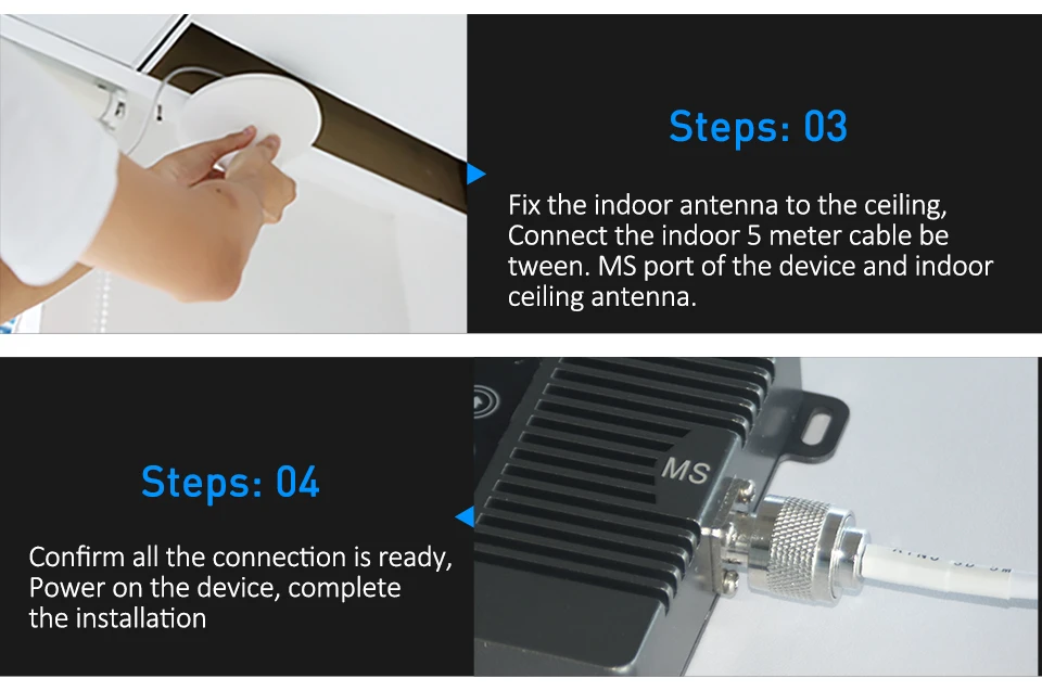 1. Получает сигнал Мощная антенна достигает доступа к хорошему сигналу и доставляет его к бустеру. 2. Повышает сигнал Усилитель получает сигнал, усиливает его и служит в качестве реле между вашим телефоном и ближайшей башней сотовой связи. 3. Сигнал передачи Ваши устройства получают увеличенный прием ячеек, а звонки и данные подаются через усилитель обратно в сеть. Примечание: Пожалуйста, убедитесь, что место, где вы собираетесь установить LTE 4G и убедитесь в том, что вы можете получить по крайней мере 2 планки 4G "LTE» сигнал на открытом воздухе, прежде чем вы покупаете, В противном случае этот продукт не может вам помочь. Для улучшения сигнала в помещении необходим хороший внешний сигнал.