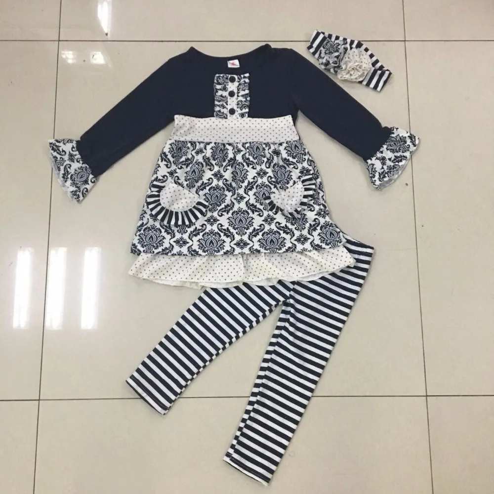Новое поступление детская одежда Мода 2017 осенний принт костюмы с карманом платье девушки полосатые брюки хлопок комплекты с оголовьем F180