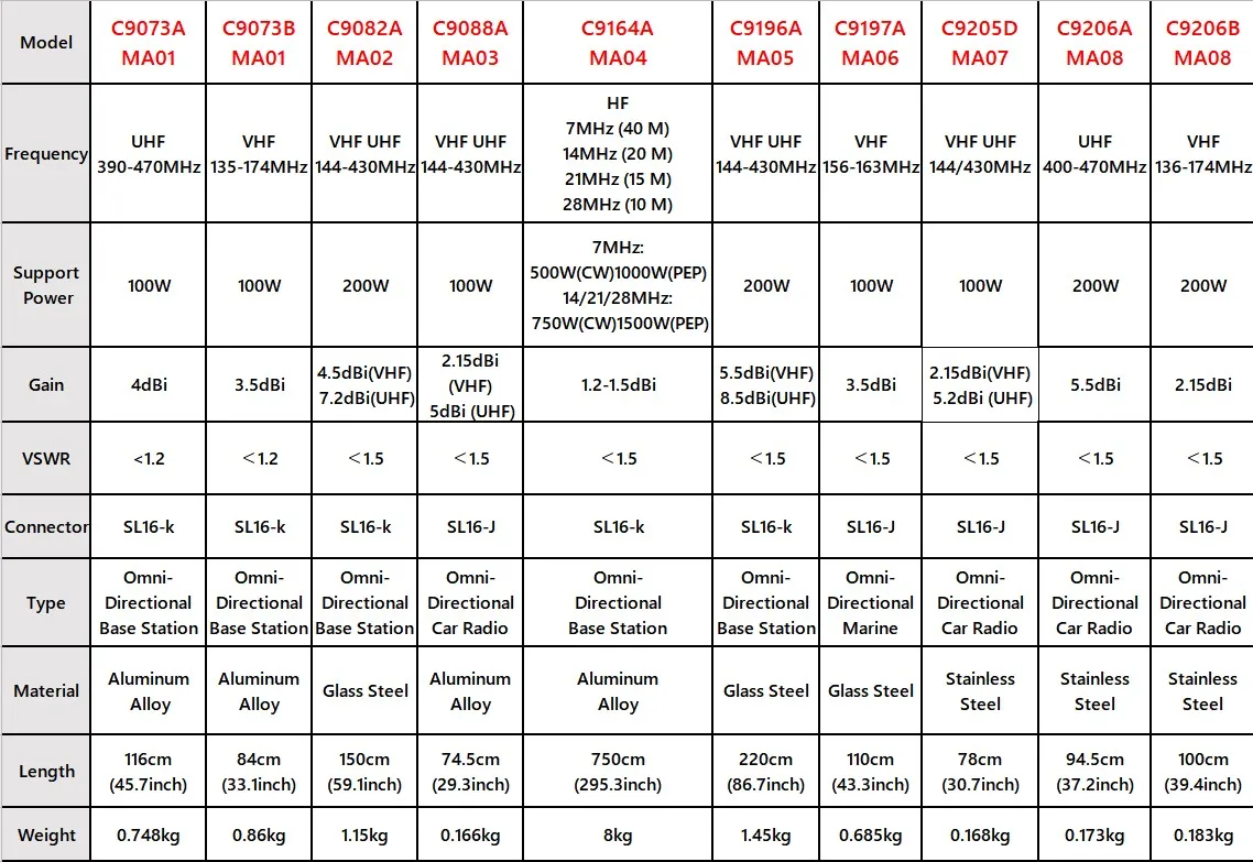 Комбинация магнитного крепления и антенны. Включает 3,9 м/фута RG58 C/U коаксиальный кабель с SL1 6/PL259. Спецификация: Модель: Retevis MR100 Частотный диапазон: 144/430 МГц (136-174 МГц и 400-470 МГц) Импеданс: 50Ω Максимальная мощность: 70 Вт Усиление: 2,15 дБи Тип разъема: SL16/PL259 Тип коаксиального кабеля: RG58 C/U Длина коаксиального кабеля: 3,9 м Высота (магнитное крепление и антенна):479 мм Диаметр шасси: 90 мм/3,54 дюйма Вес (магнитное крепление и антенна):550 г/1,21 фунта |