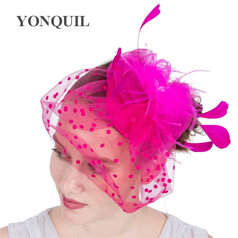 Ярко-розовый кринолин головной убор заколка для волос с вуалью перо головной убор Коктейльные Вечерние шляпы Дерби Свадебный головной убор аксессуары для волос