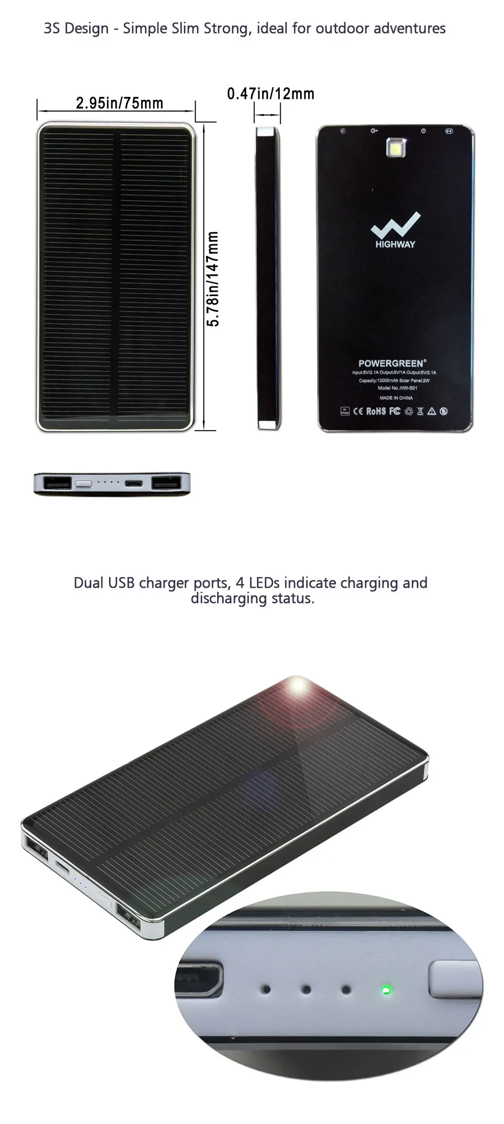 - Для Избегайте каких-либо задержек при отправке, p Заполните полное имя получателя в заказе из-за новой политики Российской таможни, в противном случае вы, вероятно, не получите посылку наконец. -Мы не несем ответственности за недоставку, вызванную заказчиком, который не предоставил достаточно информации при оформлении заказа. PowerGreen Солнечный аккумулятор 10000 мАч тонкое солнечное зарядное устройство Внешняя батарея резервного копирования для телефона Технические характеристики Бренд |