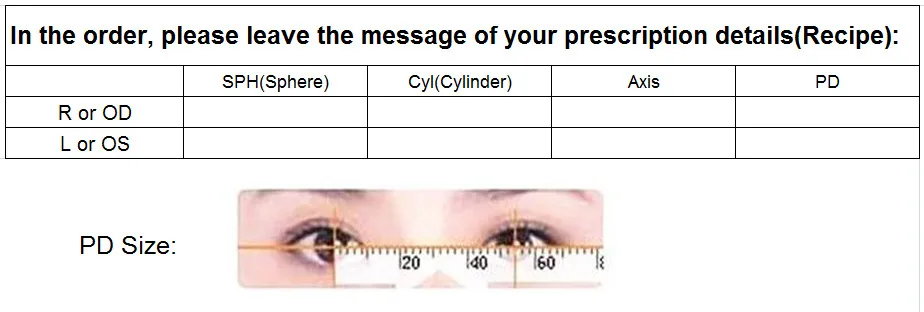 Мы также можем изготовить очки по рецепту, пожалуйста, также купите одну пару линз в нашем магазине и оставьте заметку о ваших рецептах на глаза (включая SPH, CYL, PD и т. д.), мы сделаем по мере необходимости, линзы по ссылке ниже: (Купите одну оправа и одну пару линз вместе)
