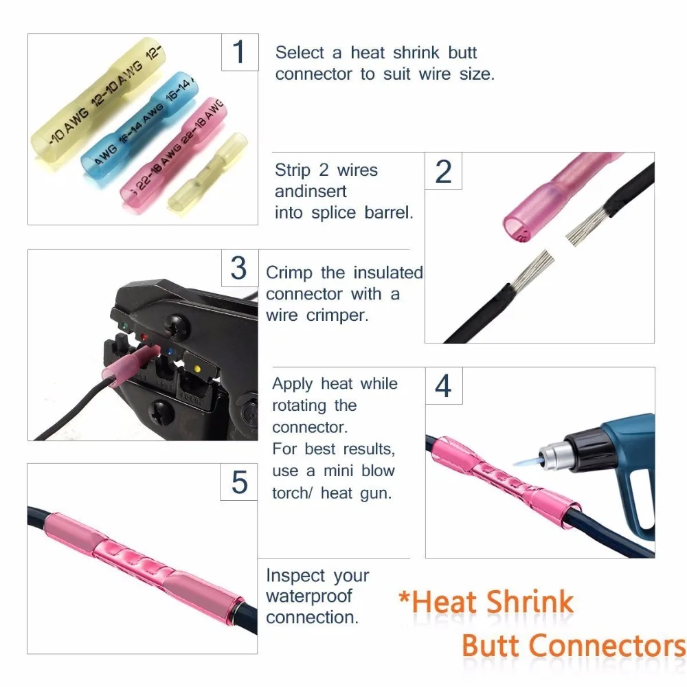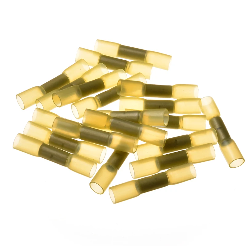 -Стандартный обжим, а затем уплотнение Термоусадочных стыковых соединителей. -Гарантированно удерживает сильные щипцы. -Двухслойный дизайн, полиолефиновые трубки снаружи и термоплавкий клей внутри. -Обеспечивает визуальный осмотр, предотвращает коррозию и обеспечивает водонепроницаемое уплотнение. -Для достижения наилучших результатов используйте пистолет горячего воздуха до тех пор, пока он не уменьшит размер и поток клея, заполнение зазоров в терминале