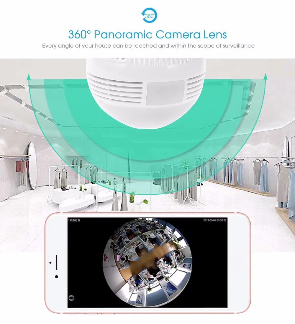 -С 360 градусов панорамная камера, каждый угол вашего дома может быть достигнут и в пределах наблюдения-Двухсторонняя связь, встроенный динамик и микрофон. Когда любое движение обнаруживается, камера будет оповещать о интеллектуальном устройстве пользователя, таким образом пользователь может передать сообщение от приложения и камеры, чтобы напугать воров. Без сомнения, вы также можете общаться с вашей семьей или вашим любимцем через камеру