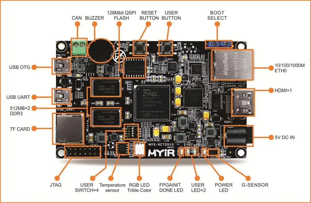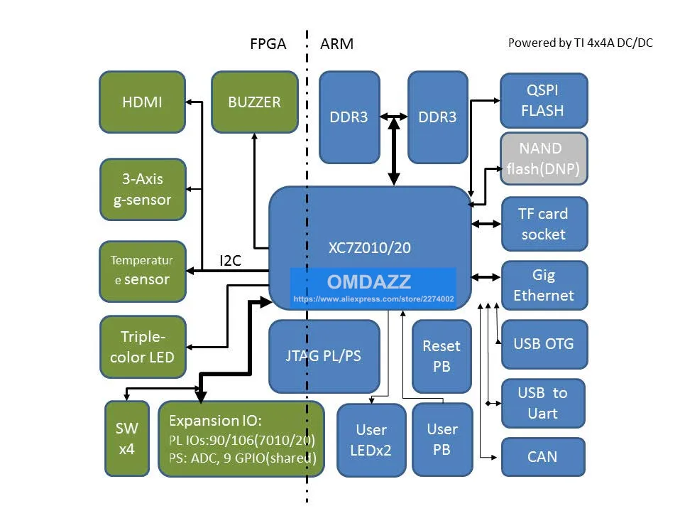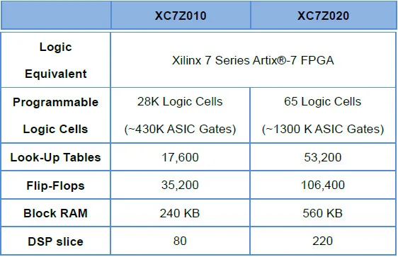 Плата разработки использует Xilinx Zynq-7000 программируемый SoC XC7Z010/XC7Z020. Жесткий интегрирующий ARM процессор с FPGA framework, Zynq-7000 серия SoC включает в себя ядро системы обработки (PS) с двумя рукоятками®Кортекс™-Ядро A9 и программируемый логический блок (PL). Процессор ARM обладает более мощной вычислительной мощностью, чем его аналог на рынке, и FPGA framework