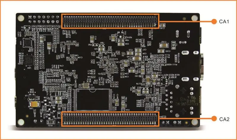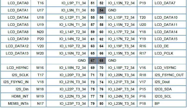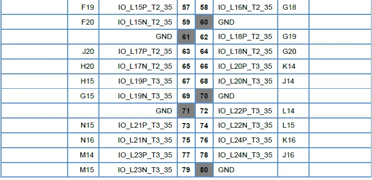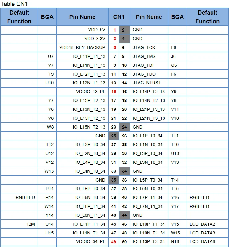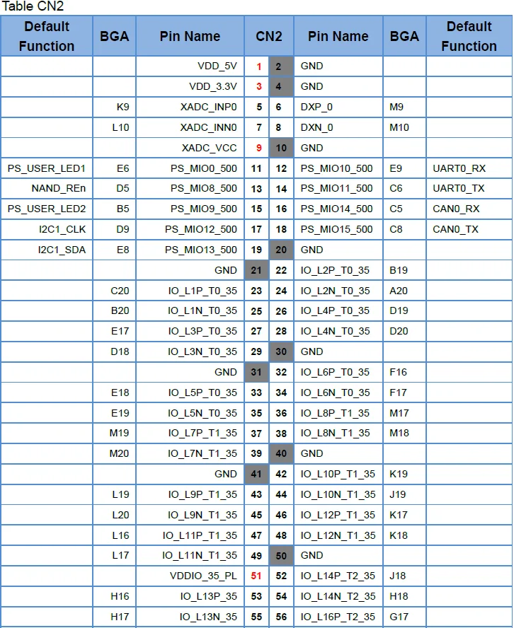 Два расширенных интерфейса на макетной плате-CN1 и CN2, которые можно использовать для подключения доковой платы для расширения ее функции. Так же, как показано в следующей таблице, слот, похожий на IO_L11P_T1_13, предназначен для PL pin, а слот, похожий на PS_MIO9_500, предназначен для PS pin. Последний номер показывает конкретный банк.