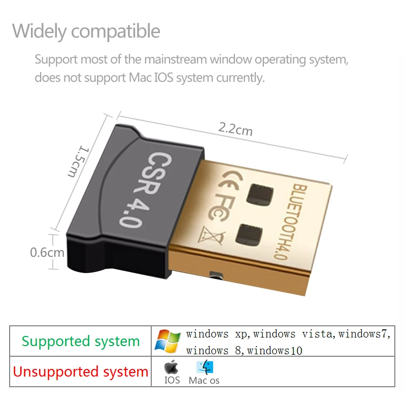 1. Тип: Bluetooth-адаптер 2. Материал: металл, пластик 3. Версия: CSR4.0 + EDR 4. Операционная система: Windows 98/2000/XP/Vista Windows7/8/10 5. Интерфейс: USB соблюдение 6. Скорость: 3 Мбит/с 7. Диапазон приема/отправки: до 20 м/65.6ft 8. Сертификация: FCC, CE 9. Размеры: 2,2*1,5*0,6 см 10. Вес нетто: 3 г
