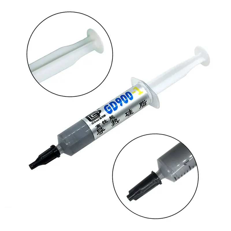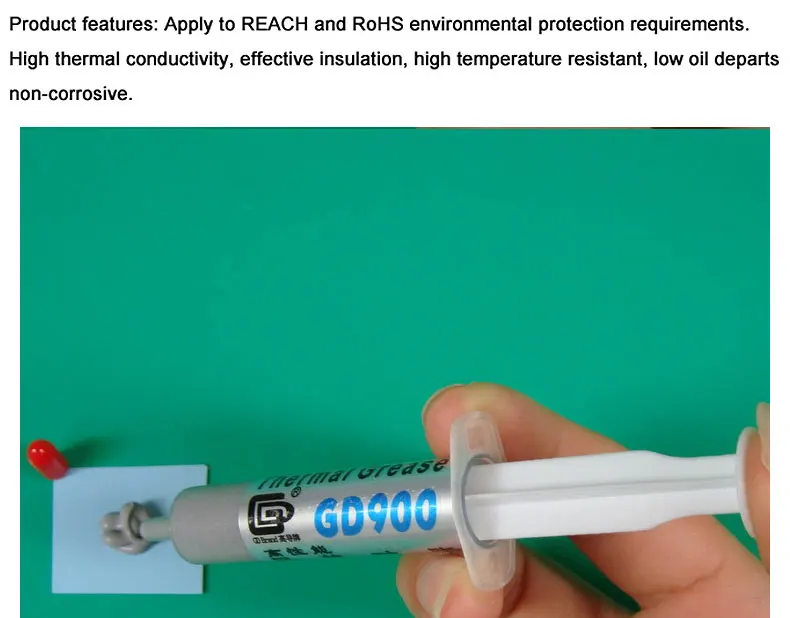 GD900 Тепловая паста выбирает гораздо более крошечные частицы диаметром оксида металла в качестве основного сырья, используется для заполнения зазора между источником тепла и устройством теплоотвода. Его Выдающаяся производительность на светодиодах, осветительных аксессуарах, ЦП будет соответствовать вашему высокому стандарту для системы охлаждения.