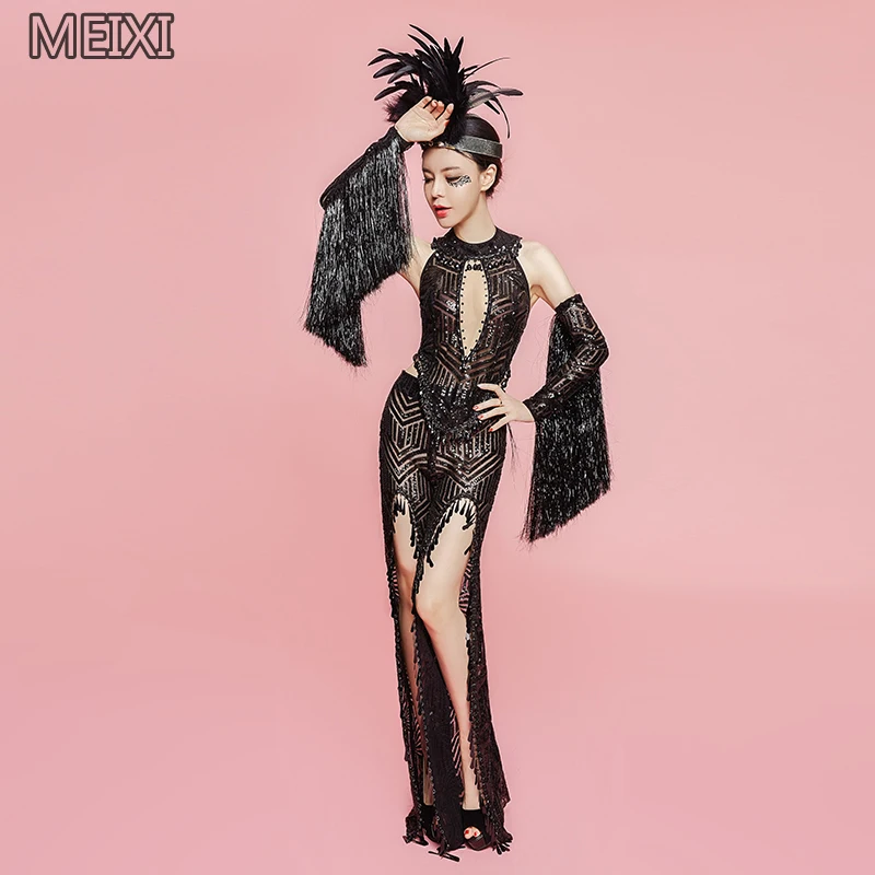 Отзывы о Суперсексуальный блестящий черный костюм с вырезами брюки бахромой костюмы для
