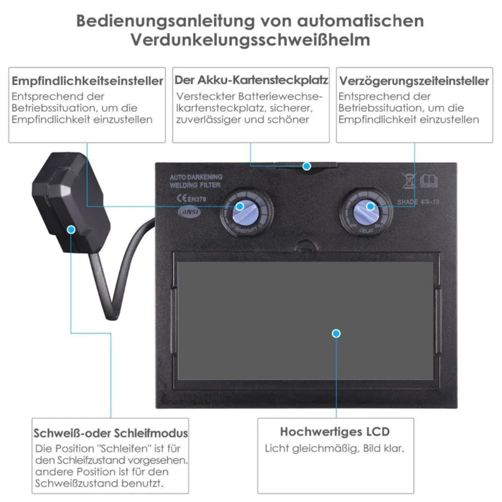 Автоматический сварочный шлем обеспечивает хорошую защиту головы, лица и глаз. Особенно важна защитная функция глаз и защитная функция от ИК и УФ-излучения, что, безусловно, является корпусом. Шлем подходит для сварки MIG/MAG/TIG и arc. В течение очень короткого времени автоматический сварочный шлем темнеет и не требует батареек благодаря интегрированным солнечным элементам.