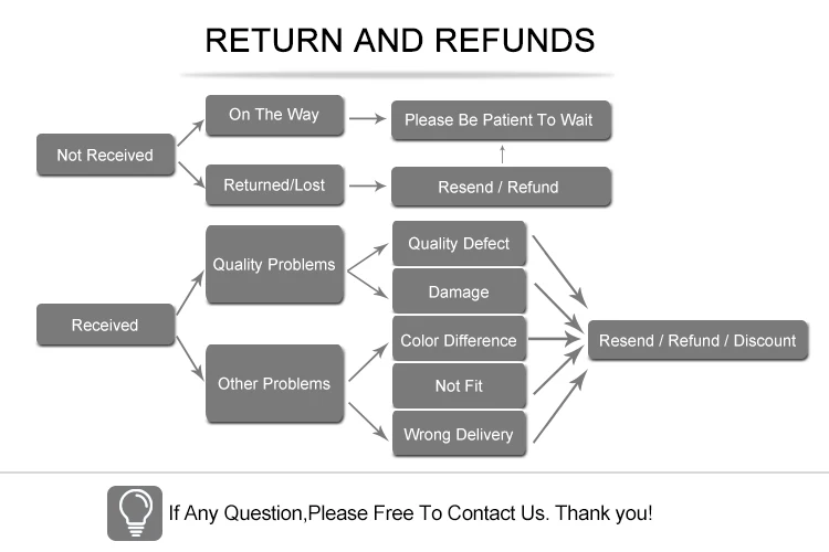 Наша продукция имеет гарантию на один год. Покупатели должны связаться с нами, чтобы отправить дефектные товары обратно для обмена в течение гарантийного срока. Гарантийный период начинается с получения товаров первоначальным грузополучателем. Если вы получили неправильный или бракованный товар, пожалуйста, свяжитесь с нами в течение 1-3 дней с даты получения товара, мы расскажем вам точный процесс возврата. Если возникнут какие-либо проблемы с товарами, которые вы купили, мы произведем обмен или вернем оплату товара (стоимость доставки и обработки не включены) в течение 60 дней после подтверждения получения товара.