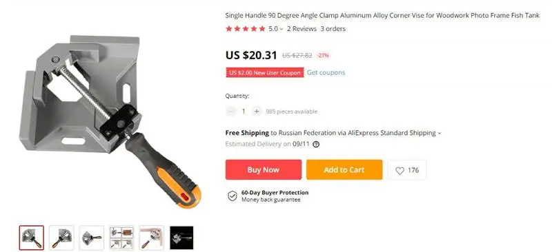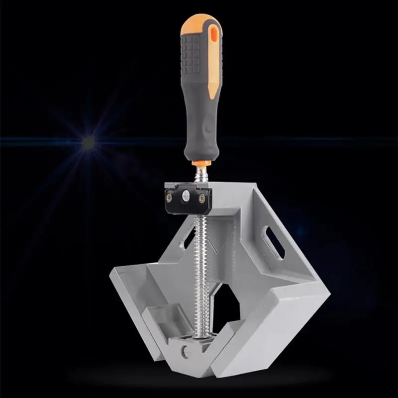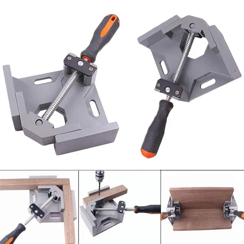 Изделие представляет собой зажим под прямым углом, который изготовлен из алюминиевого сплава для длительного использования. Это быстро для того чтобы настроить и легко регулировать. Его можно использовать для фото обрамления, деревообработки, установки мебели, сверления и т. д.