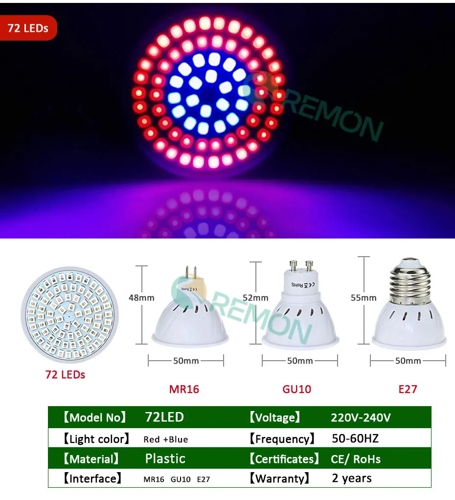 Купить Фитолампа светодиодная полного спектра 220 В E27 GU10 MR16 36 54 72 | Фитолампы
