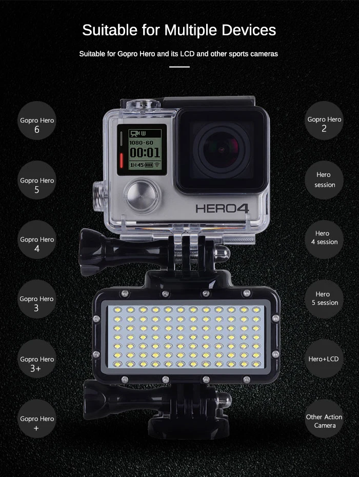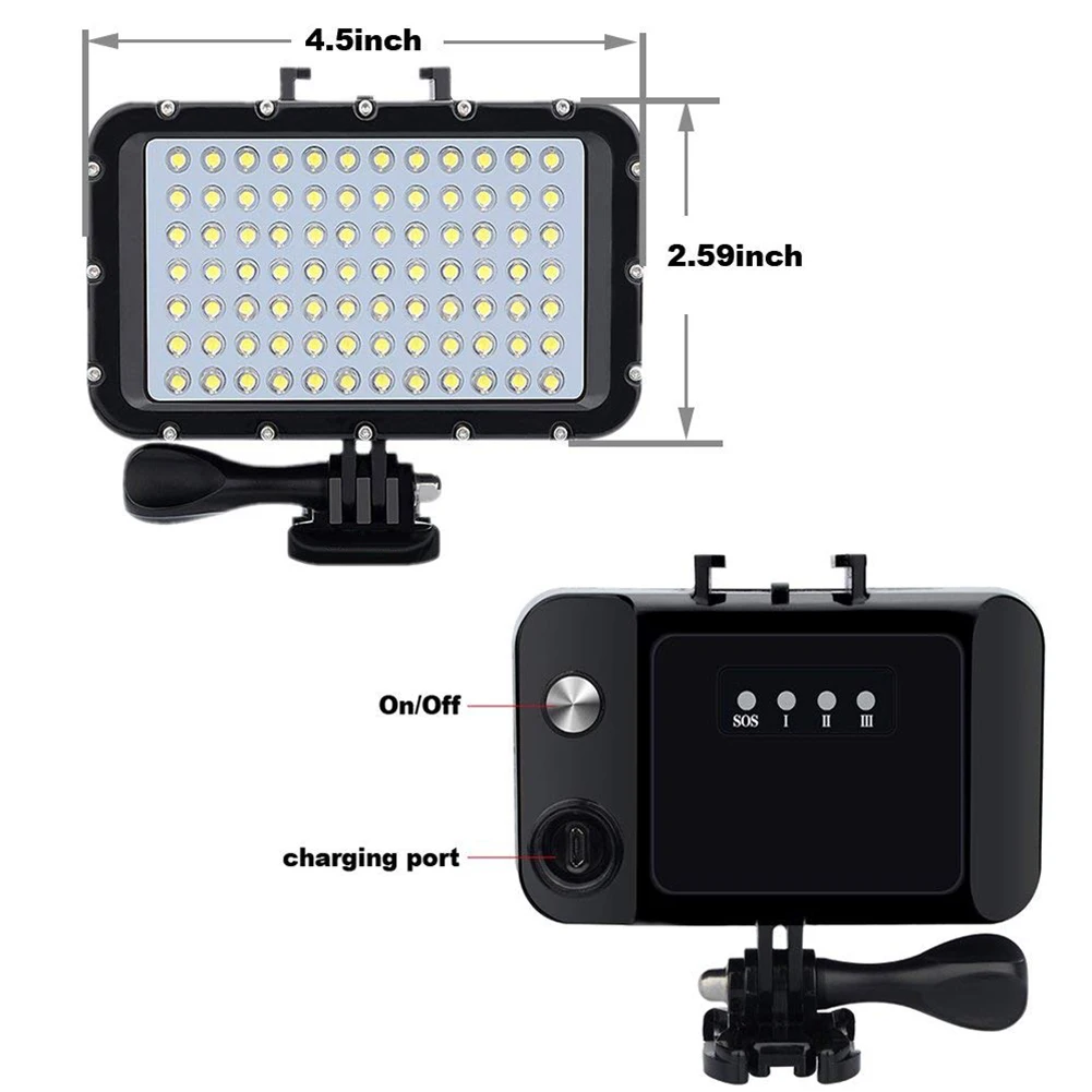 Описание: Тип изделия: светильник Идеально подходит: Для камеры Canon slr Для зеркальной камеры Nikon Для slr камеры Sony Для камеры Panasonic slr Для Камеры Pentax slr Для Gopro hero 6 Для Gopro hero 5 Для Gopro hero 2018 Для Gopro hero 4 Для Gopro hero 3 + Для Gopro hero 3 Для Gopro hero session Прочая зеркальная камера Другая экшн-камера. Водонепроницаемость: 164фт (50 м) Батарея: встроенная 2600Mha литиевая батарея Светодиодный светильник: 84-светодиодный s светодиодный дизайн высокой яркости Люкс: 5000lux Цветовая температура: 5500k 4 режима освещения: Высокий светильник режимы: Применение около 2,5 часов Середины светильник режимы: около 3,5 часов Низкий светильник: около 5 часов Режимы SOS: около 9 часов. Материал: нержавеющая сталь + Поликарбонат Размер: 4.33x3.93x2.16 дюймов Вес: 0.44lb Цвет: черный Посылка включает: 1x огни 1x адаптер для крепления холодного башмака 1xmicro USB кабель 1x быстроразъемное крепление 1х винт 1 гаечный ключ
