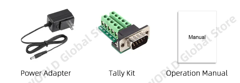 1x 3A Power Adapter, 1x Tally Kit, 1x Operation Manual