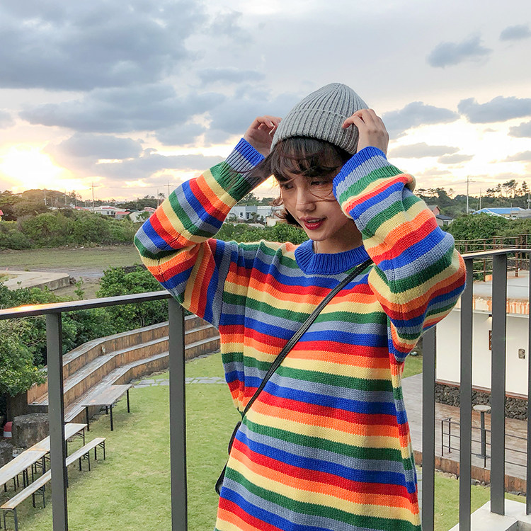 Купить 2018 autumn and winter loose rainbow stripe knitted O neck sweaters womens pullovers (F1337) | Женская одежда