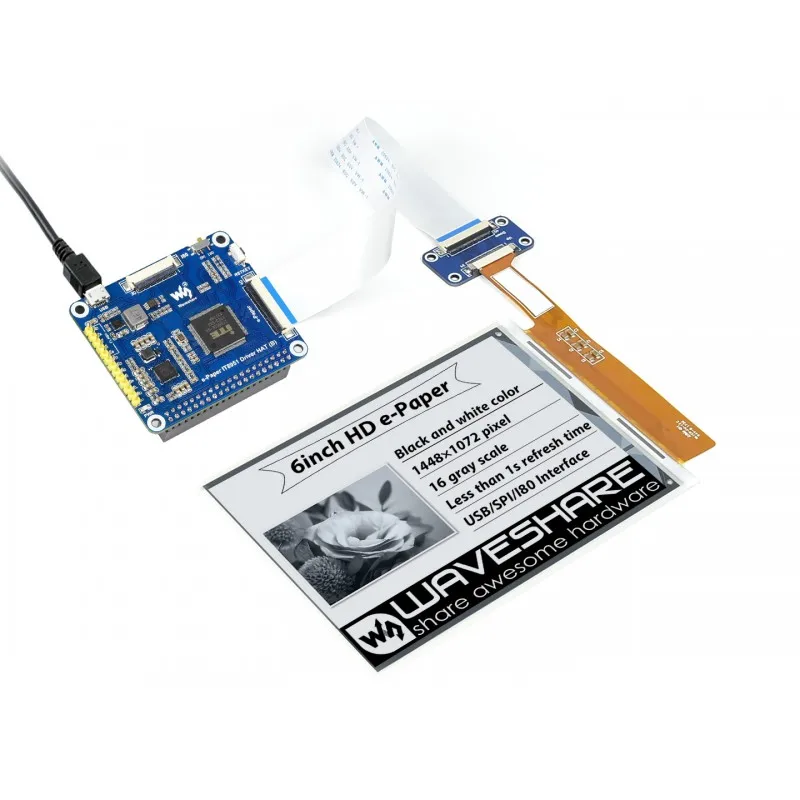 ОбзорЭто шляпа дисплея E-Ink для Raspberry Pi, 6 дюймов, 1448 × 1072 высокой четкости, со встроенным контроллером IT8951, общаясь через интерфейс USB/SPI/I80, поддерживает частичное обновление.