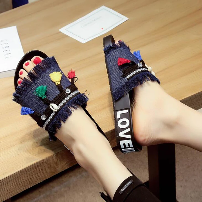 Отзывы о Сланцы женские из денима пляжные шлепанцы с кристаллами бахромой без застежки