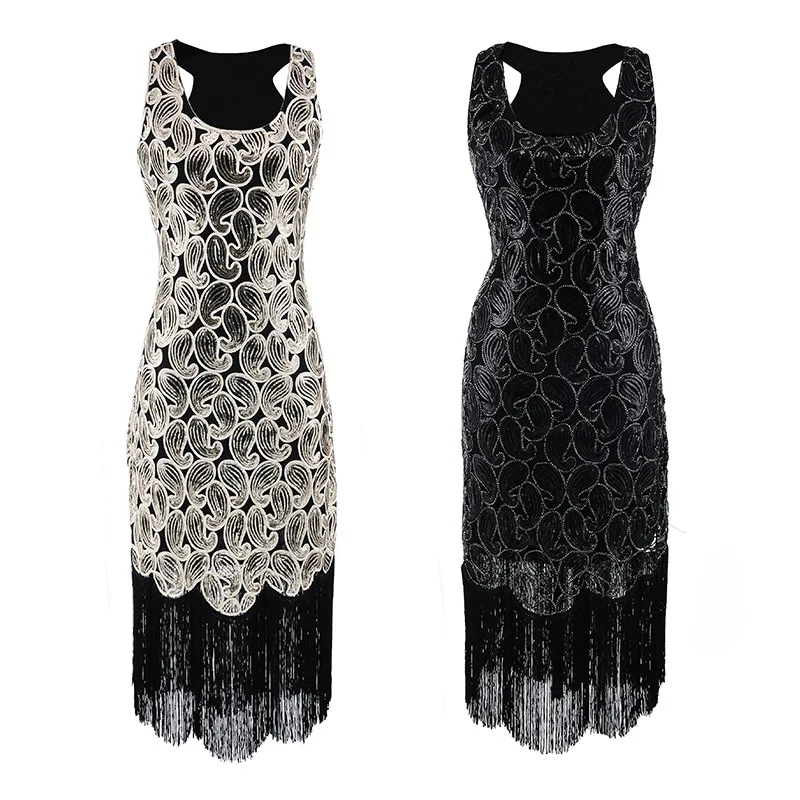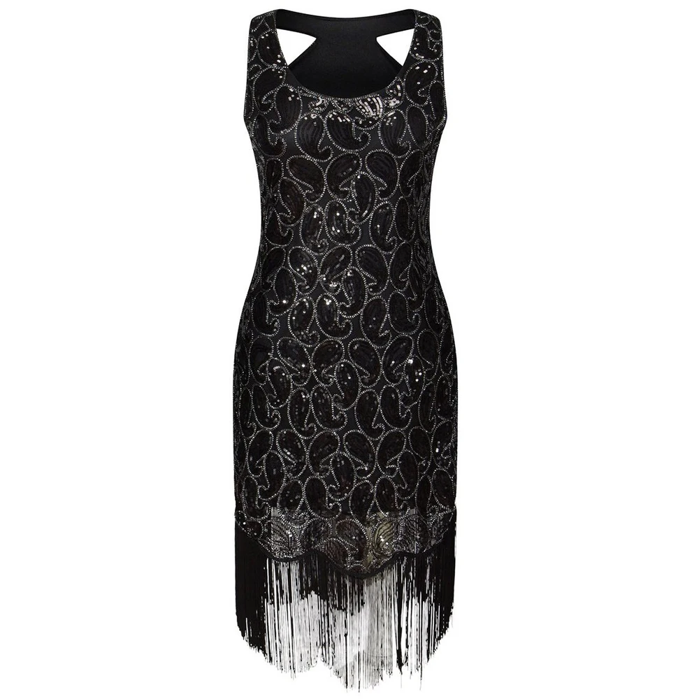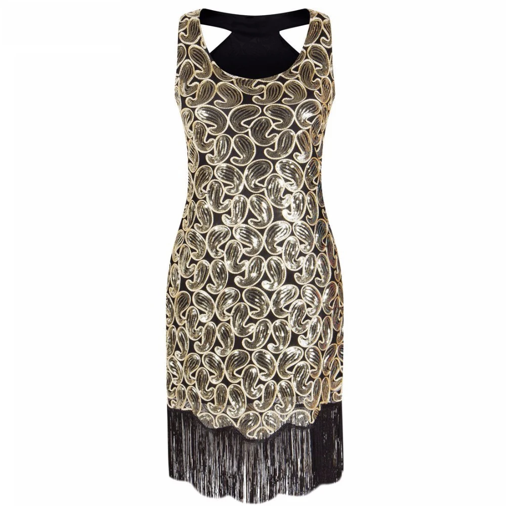 Для женщин 1920s блесток Пейсли узор без рукавов-борцовка и хлопушки черные женские модельные туфли золотистого цвета пикантная бахрома Великий Гэтсби вечерние платья