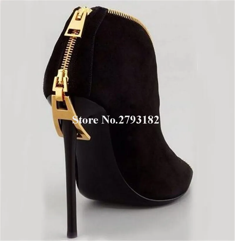 Brand Design Women Fashion Peep Toe Suede Leather Gold Zipper in Heel Short Boots Black High Heel Ankle Booties Club Shoes