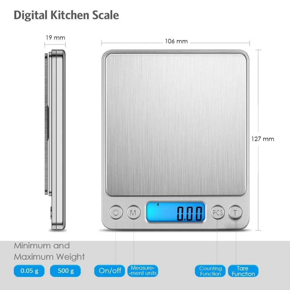 Цифровые кухонные весы, мини карманные ювелирные весы для приготовления пищи, весы с ЖК-дисплеем с подсветкой, 500 г-0,01 г/1000 г-0,1 г/3000 г-0,1 г 100% новый товар высокого качества. Большая немагнитная платформа из нержавеющей стали. Два весовых лотка, маленький один лоток для защиты весов во время хранения или транспортировки. Большой один для сыпучих предметов ЖК-дисплей с подсветкой-светильник. Функция тары для получения веса нетто. Индикатор перегрузки. Автоматическое отключение питания. Дисплей: ЖК-дисплей с синим светильник Простой в использовании. Емкость: 500 г/1000 г/3000 г Разрешение: 0,01g/0,1g/0,1g Единицы взвешивания: g, gn, ct oz, ozt. Dwt Питание: 2 аккумулятора AAA Цвет: Серебряная обувь Размеры: 13 см x 16 см x 3 см, Размер платформы: 10X10 см Вес: Matal 【High-Precision & Wide Range кухонные весы AMIR, построенные с высокоточной сенсорной системой, обеспечивают мгновенные и точные результаты от 0,05 г до 500 г. Легко чистить и использовать, делает его идеальным для измерения ювелирных изделий, лекарств и приготовления ингредиентов с изысканной точностью. ◆【Материалы высшего качества 】 умные цифровые карманные весы изготовлены, чтобы быть сильным, точным, быстрым и удобным для пользователя. Изготовленные с высококачественной платформой из нержавеющей стали и каркасом из АБС-пластика, эти цифровые кухонные весы прочны и легко моются.