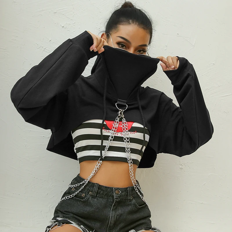 Черный укороченный свитер с капюшоном для женщин Свободный пуловер цепочкой в - купить