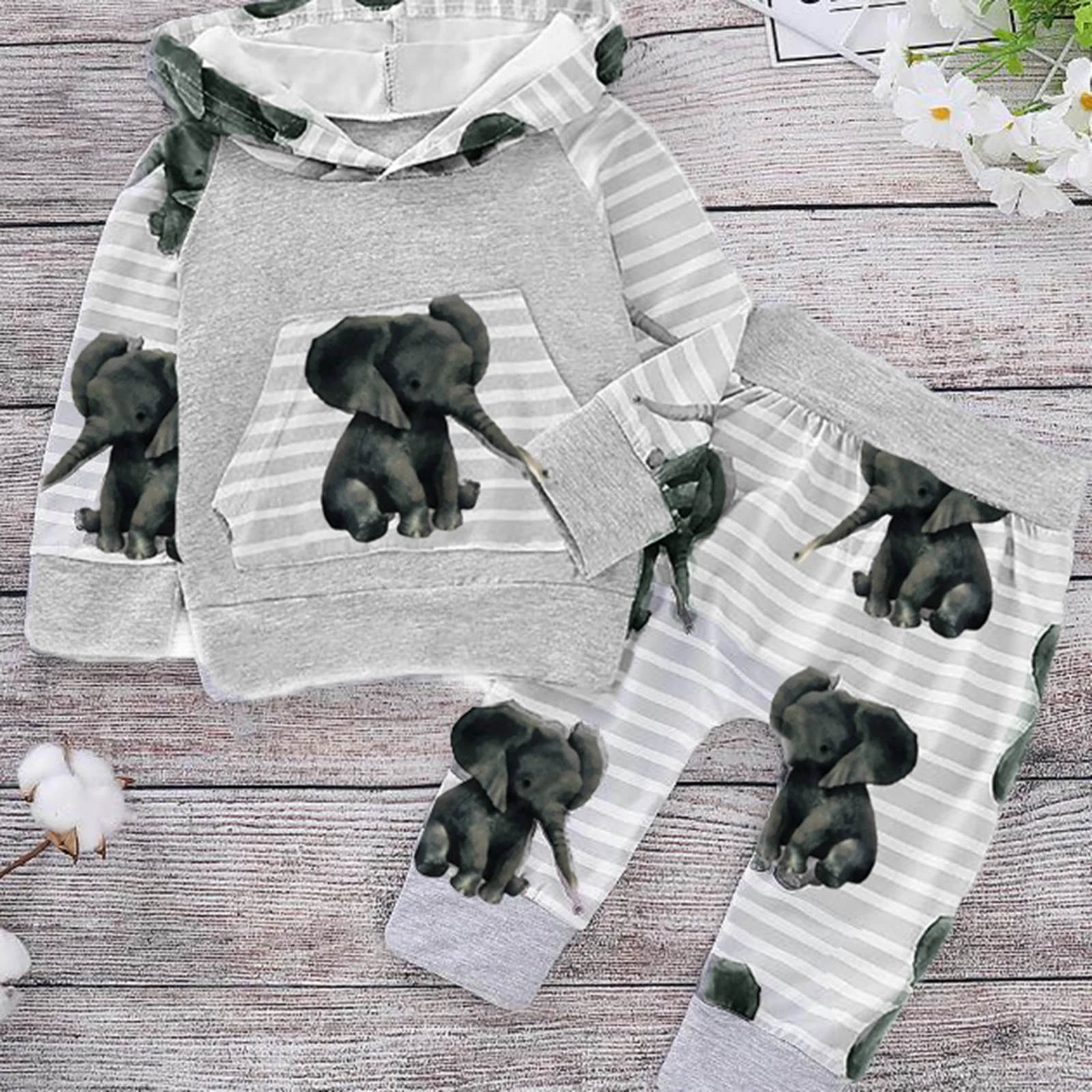 Купить Puseky Winter 2pcs Kids Baby Elephant Print Long Sleeve Hooded Sweatshirt Tops With Pants Trousers Set 0-18M Newborn Tracksuits |
