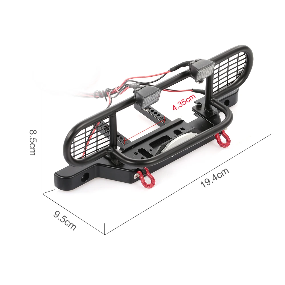 Этот металлический бампер RC автомобиля включает в себя 4 светодиодных светильника, прицеп крюк, просто сделать вас платить меньше, но получить больше. Он обеспечивает защиту кузова автомобиля и очень яркое освещение для овладения жесткими тропами. Установка не могла быть проще, она подходит для TRX-4, RC4WD, AXIAL, SCX10 RC автомобилей. Хороший выбор