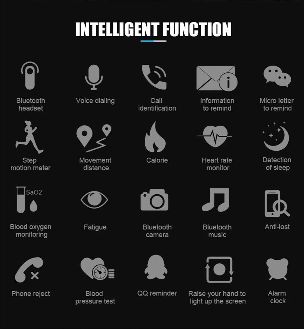 Это многофункциональный браслет, bluetooth-гарнитура может говорить, автомобильная bluetooth-гарнитура, информационный толчок, слушать музыку. Пусть ваша жизнь будет богатой, а не одинокой. Динамический и статический пульс, кровяное давление, мониторинг кислорода в крови, мониторинг сна, измерение данных упражнений: калории, напоминание о сидячем положении, мониторинг сна, подсчет шагов, мониторинг состояния здоровья в реальном времени, Сделайте ваше движение более красочным. Отображение информации о вызывающем абоненте, сидячая вибрация, вибрация будильника, отказ от вызова, музыка, Переключение Обоев, умный голос. Цветной экран 0,96tft, время работы более 58 часов, время работы в режиме ожидания более 26 дней, аккумулятор 110 мАч, продолжительность вызова 5 часов, время зарядки 1 час Поддержка приложения: китайский, английский, японский, корейский, немецкий, французский, испанский, итальянский.Параметр