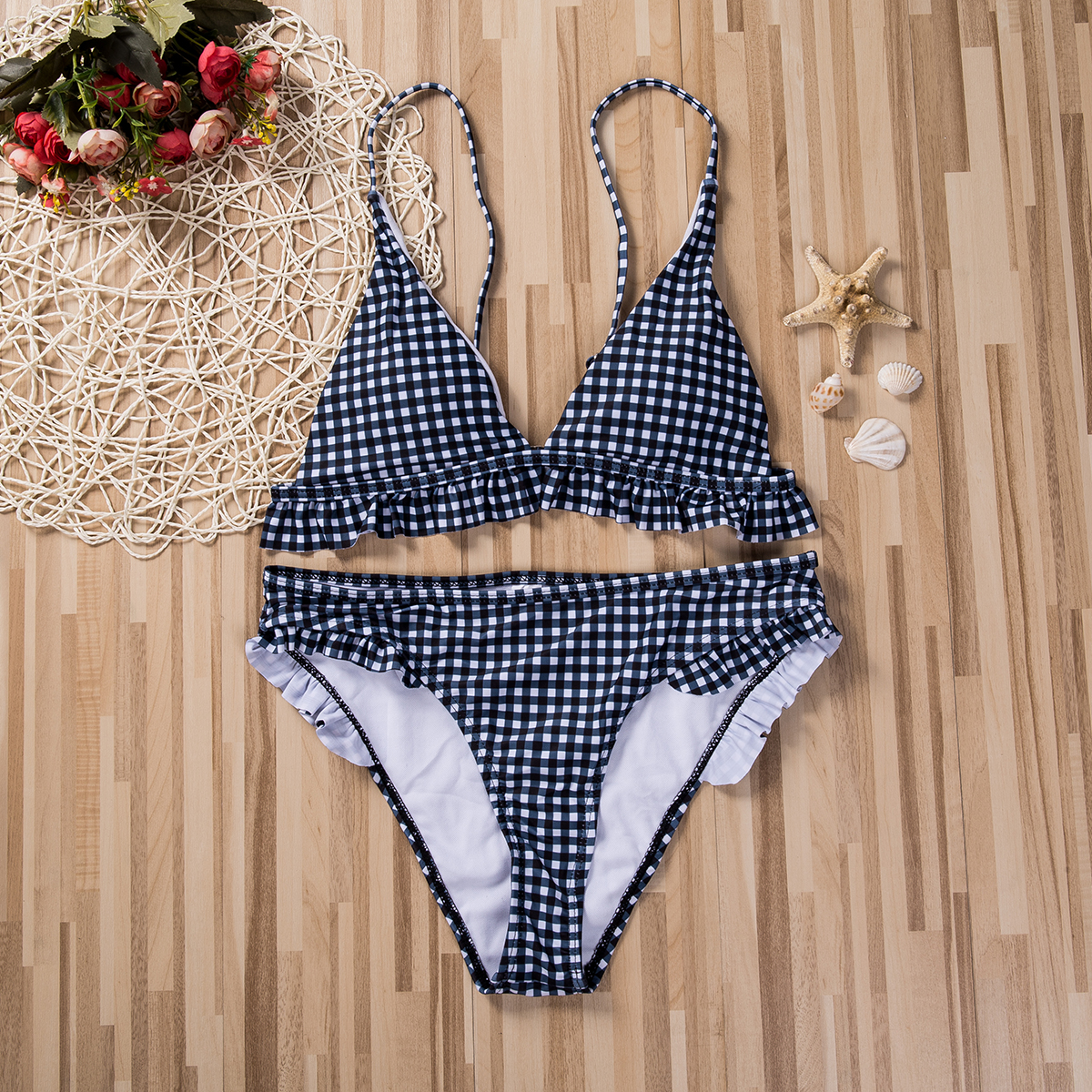 Комплект бикини в клетку, женский милый купальник с оборками, сексуальный купальник с низкой талией, Раздельный купальный костюм из двух предметов