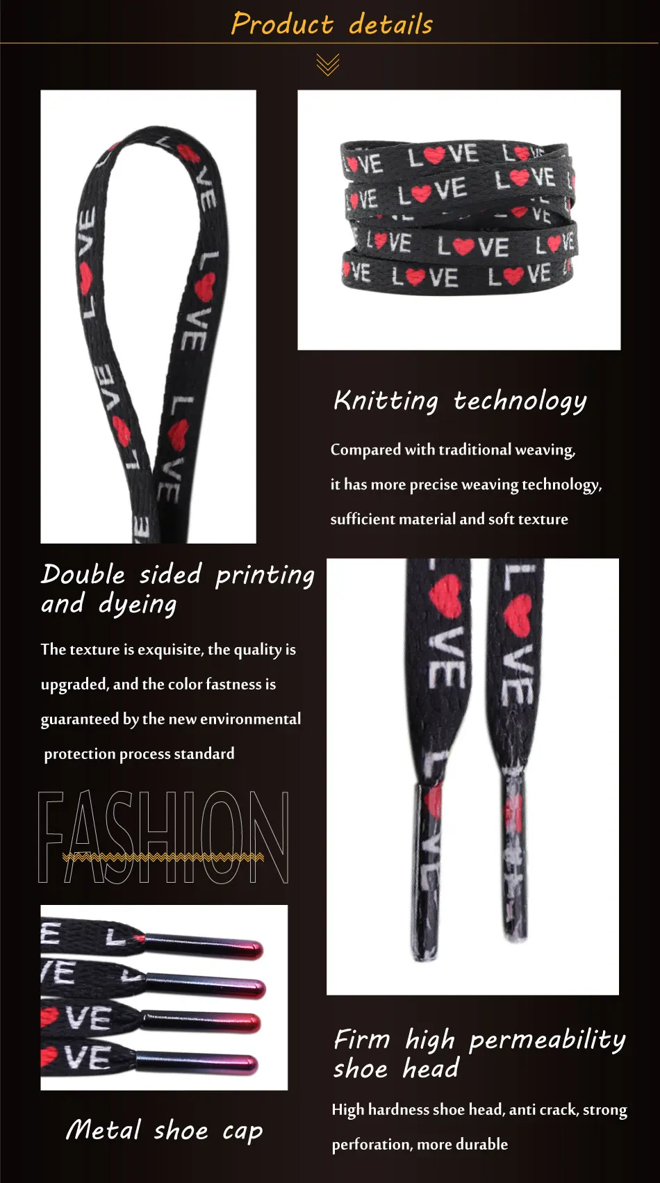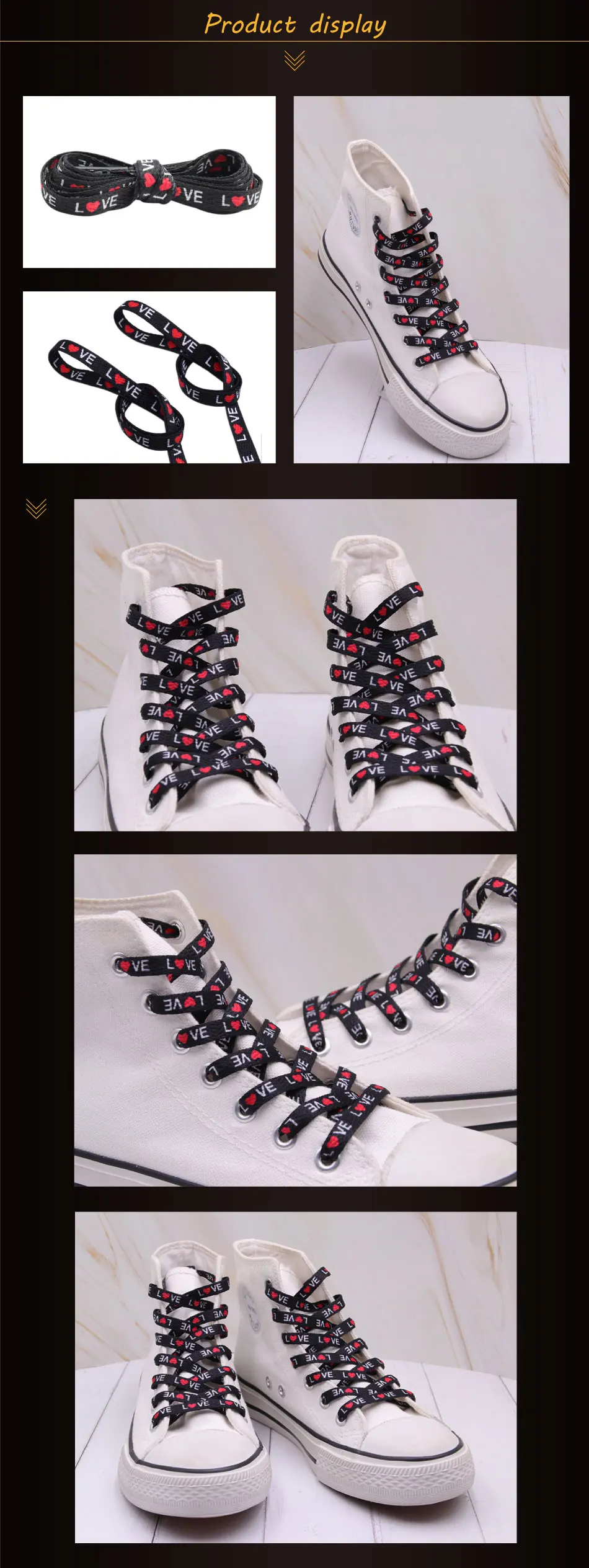 Материал: полиэстер, красный, черный Функции/скобы/Применение: шнурки для обуви, шнурки для талии, веревки для шляп и т. Д. Цвет/разноцветная комбинация: любовь, принт красное сердце Характеристики: 60-180 см * 7 мм Диаметр/Ширина: 0,7 см Тип формы: плоский Головки шнурков: Красные, черные наконечники Общий вес: 40 г Сертификат: Oeko-tex-100,ISO9001,SGS,CE, производство Китай Посылка: 1 пара/полиэтиленовый пакет opp Подгонянный: цвет, длина, ширина, логотип печати, пожалуйста, свяжитесь с нашей службой поддержки клиентов