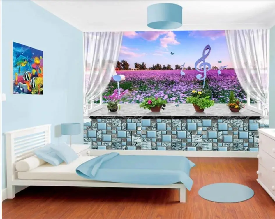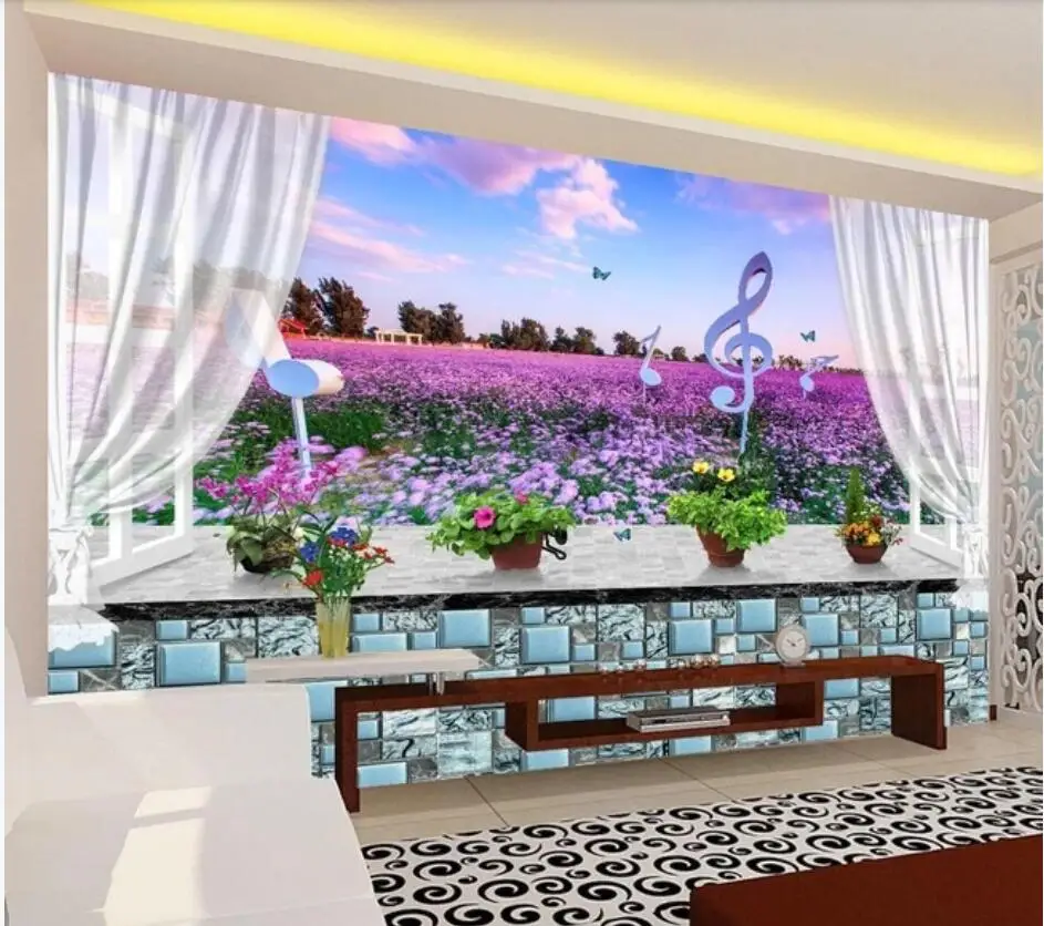 Купить Фотообои 3D с индивидуальным мурашкой окна, лавандой и морским фоном для украшения стен в гостиной.