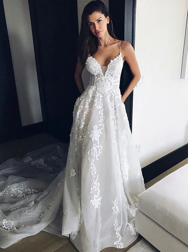Купить Кружевное свадебное платье в стиле бохо на тонких бретелях с V-образным вырезом