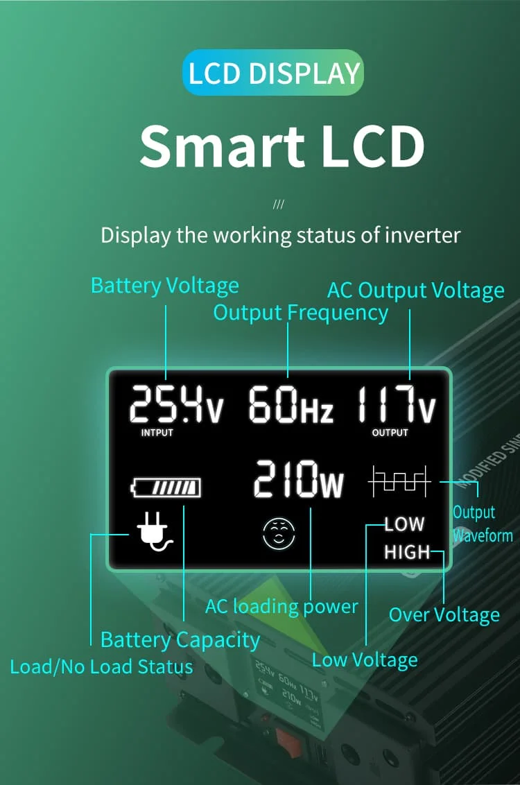 Это означает, что электроприбор большой мощности, принцип работы которого является электромагнитной индукцией. Например, двигатель, компрессор, реле и т. д. для этих продуктов пусковая мощность намного выше номинальной мощности (около 3 ~ 7 раз). Например, номинальная мощность холодильника составляет 150 Вт, но его пусковая мощность выше 1000 Вт.3. В чем разница между модифицированной и чистой синусоидальной волной?Модифицированный синусоидальный инвертор использует менее сложные схемы переключения и фильтрации. Там будут электрические шумы или помехи, которые могут предотвратить этот инвертор от правильного питания определенных нагрузок. Частота и напряжение на выходах могут отличаться и содержать некоторые шумы и искажения. Он может работать с некоторой резистивной нагрузкой, как лампа-светильник и т. Д. Но он не подходит для многих приборов и влияет на срок службы ваших приборов. С современными технологическими достижениями и быстрым пролиферацией чувствительной электроники, требующей истинной синусоидальной мощности для правильной работы. Чистые или настоящие синусоидальные инверторы предназначены для подражания этой мощности. Некоторые приборы, которые, вероятно, требуют чистой синусоидальной волны, включают компьютеры, цифровые часы, зарядное устройство, светильник, аудио и визуальное оборудование. Двигатели с переменной скоростью, насос, кондиционер и прецизионные машины, индукционная плита, микроволновая печь, компрессор, водяной насос и т. д. Инверторы чистой синусоидальной волны имеют четкое преимущество над модифицированными синусоидальными волнами синусоидальных инверторов в терминах представлений. Выберите Инвертор чистой синусоидальной волны для добра и долговечности ваших приборов. 4. Как выбрать один инвертор? -Для Резистивной нагрузки:Если вам нужен инвертор для запуска резистивной нагрузки (например, ноутбук, телевизор, электрическая плита, светодиодный светильник), пожалуйста, выберите инвертор с непрерывной мощностью выше номинальной мощности устройства. Например, для инвертора питания с непрерывной мощностью 2500 Вт рекомендуется запускать устройство с номинальной мощностью менее 2500 Вт. Лучше всего использовать 80% номинальной мощности. -Для индуктивной нагрузки:Если вам нужен инвертор для запуска индуктивной нагрузки (для устройства, такого как компрессор, двигатель, водяной насос), пожалуйста, Вычислите мощность инвертора в 3-7 раз выше номинальной мощности вашего устройства.