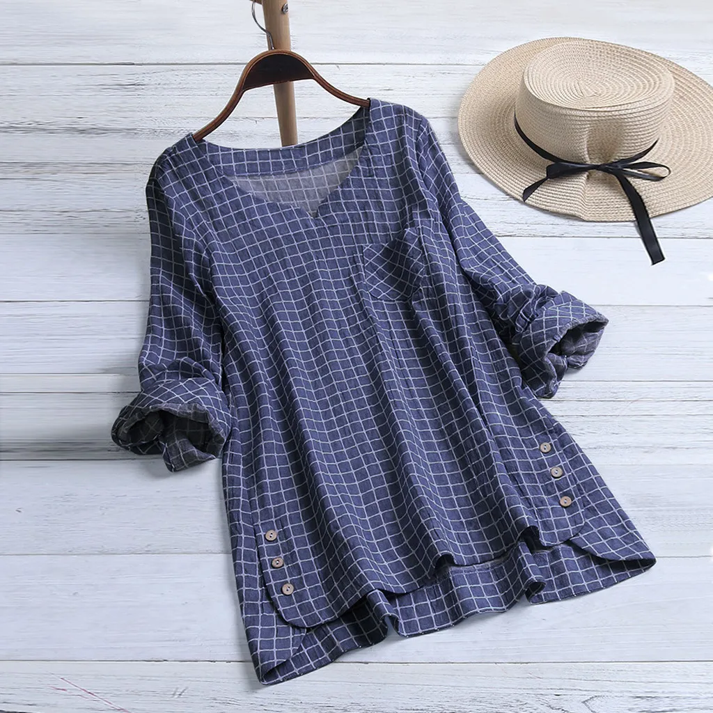 Женская Повседневная хлопковая Футболка большого размера, винтажная клетчатая Свободная блузка на пуговицах