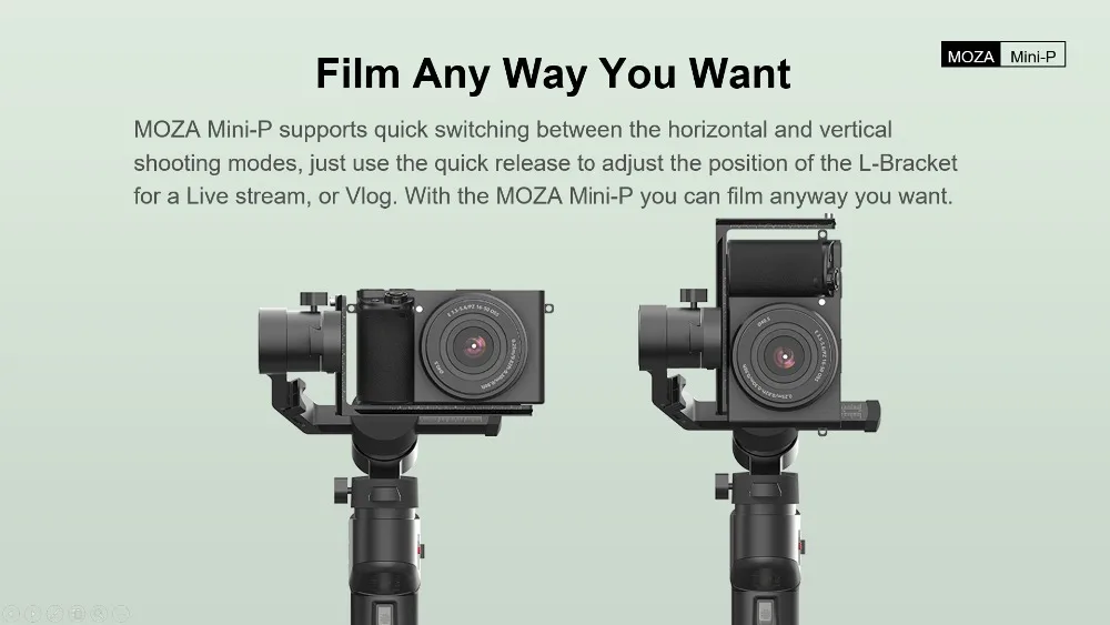 MOZA Mini-P поддерживает быстрое переключение между режимами горизонтальной и вертикальной съемки, просто используйте быстросъемку для регулировки положения l-кронштейна для прямого потока или Vlog. С MOZA Mini-P вы можете снимать любой желаемый способ.