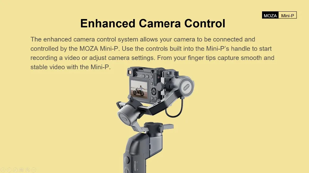Усовершенствованная система управления камерой позволяет подключать камеру и управлять ею с помощью MOZA Mini-P. Используйте элементы управления, встроенные в ручку Mini-P, чтобы начать запись видео или настроить настройки камеры. С кончиков пальцев снимайте гладкое и стабильное видео с помощью MOZA Mini-P.