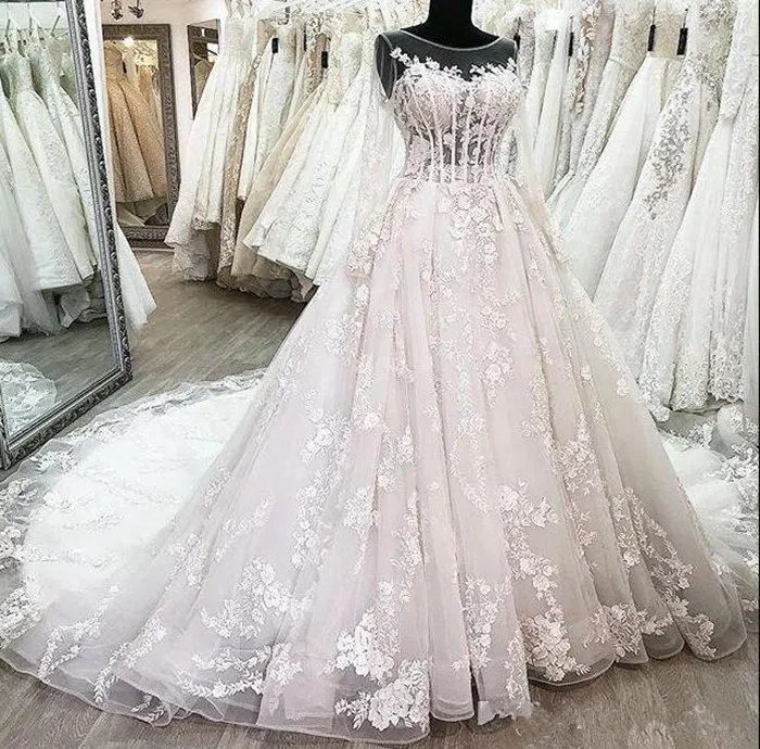 Купить Новые элегантные кружевные свадебные платья с длинным рукавом воротник Sheer Jewel