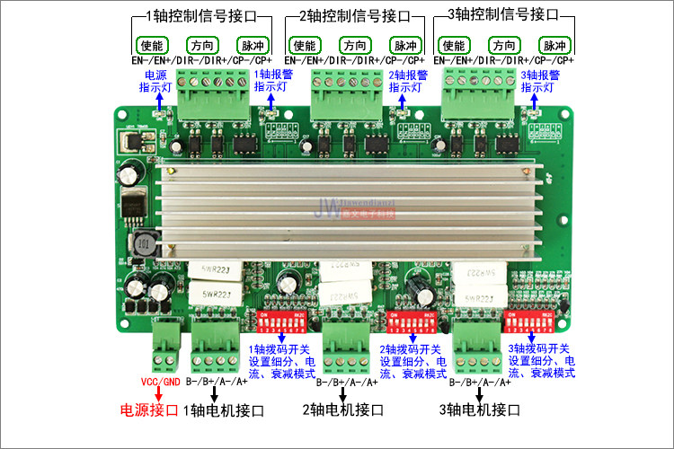 Description: The THB6064AH is a professional two-phase hybrid stepper motor driver that can drive three stepper motors simultaneously. It is suitable for 4-wire, 6-wire and 8-wire two-phase hybrid stepping motors with various current and domestic brands, current phase 4.0A and below diameter 42-57mm. Suitable for all kinds of small and medium-sized automation equipment and instruments, such as: engraving machine, marking machine, cutting machine, laser phototypesetting, plotter, CNC machine tool, pick and place device. It works especially well in devices where users expect low-cost, low-noise, low- and medium-speed operation. Features: 1. Original imported chip, can drive three stepper motors 2. Subdivision optional (2, 8, 10, 16, 20, 32, 40, 64) 3. Output current 0.5A---4.0A (suitable for 1.8NM and below 57, 42 motors) 4. Working voltage DC 9---32V 5. Signal interface is isolated by optocoupler to ensure high speed without losing step 6. Large heat sink, good heat dissipation performance 7. Strong anti-high frequency interference ability 8.4 attenuation modes are available (20%, 40%, 60%, 80%) 9. Low noise, low vibration and stable operation Electrical environment: Cooling method: Natural cooling or forced air cooling. Occasion: Do not place it next to other heat-generating equipment. Avoid dust, oil, corrosive gas, humidity and strong earthquakes. It is forbidden to have flammable gas and conductive dust. Humidity: 40-90% RH Vibration: 10-55Hz/0.15mm Storage temperature: -20-65 °C Weight: 0.4KG