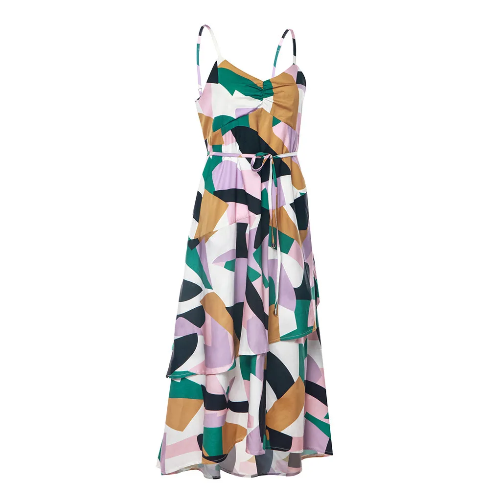 Особенности: асимметричное, платье на бретельках, многослойное, бандаж на поясе, принт, длинное платье, пляжный стиль, оборки, пикантная одежда, летнее и весеннее платье.